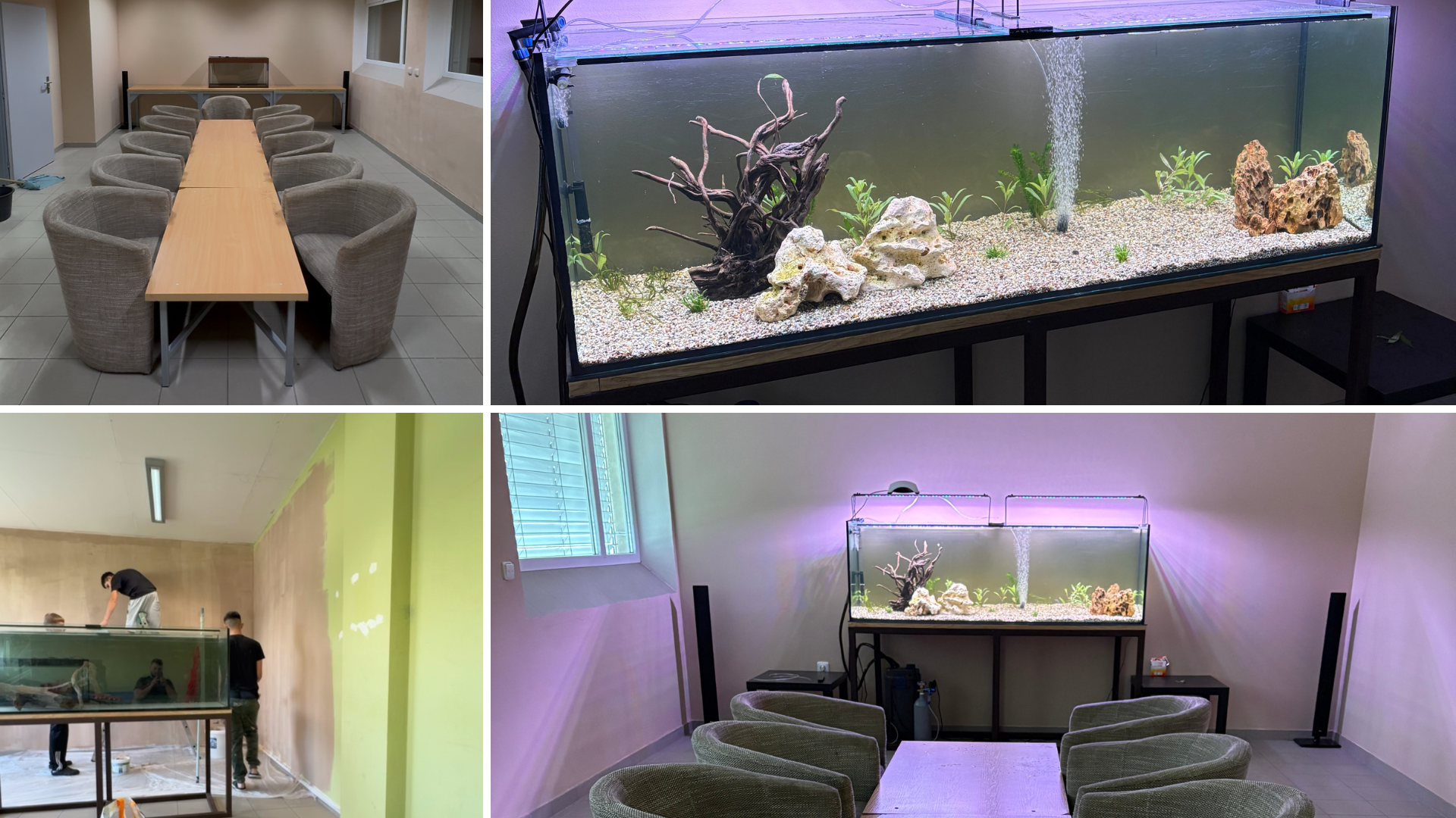 Hlavní dominantou místnosti se stalo více než dvoumetrové akvárium, které přináší do prostoru klidnou atmosféru a vizuálně celou místnost oživuje. Akvárium bylo napuštěno a založeno s odbornou péčí, a již má své první obyvatele – krevety a ancistrusy, kteří si v novém domově spokojeně žijí. Velké poděkování patří paní Vrbové, která se zasloužila o zajištění akvária a přispěla tak k vytvoření tohoto krásného prostoru.